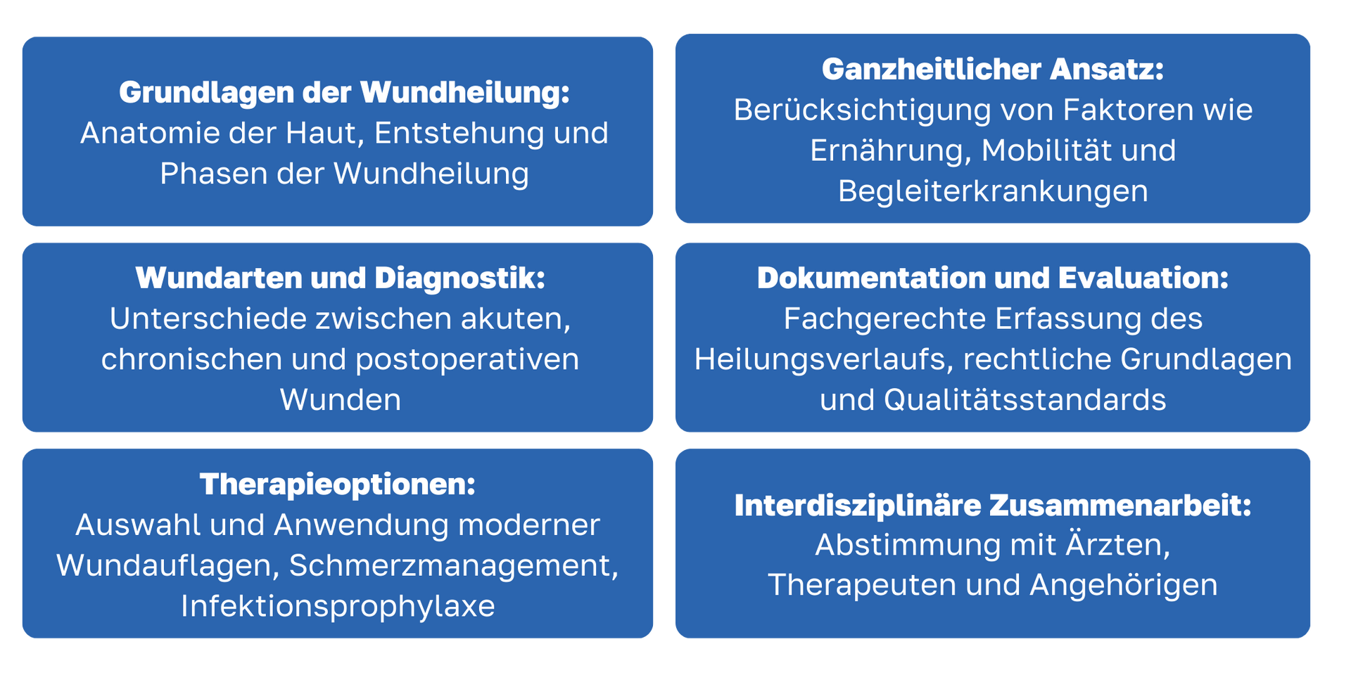 Die Ausbildung zum Wundmanager oder zur Wundmanagerin vermittelt praxisnahes Fachwissen und schließt eine Vielzahl an Themen ein: